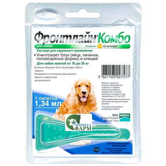 Фронтлайн Комбо L — инсекто-акарицидный препарат для борьбы с блохами (яйца, личинки, половозрелые формы) и клещами для собак массой от 10 до 20кг. Лекарственная форма: раствор для наружного применения.
